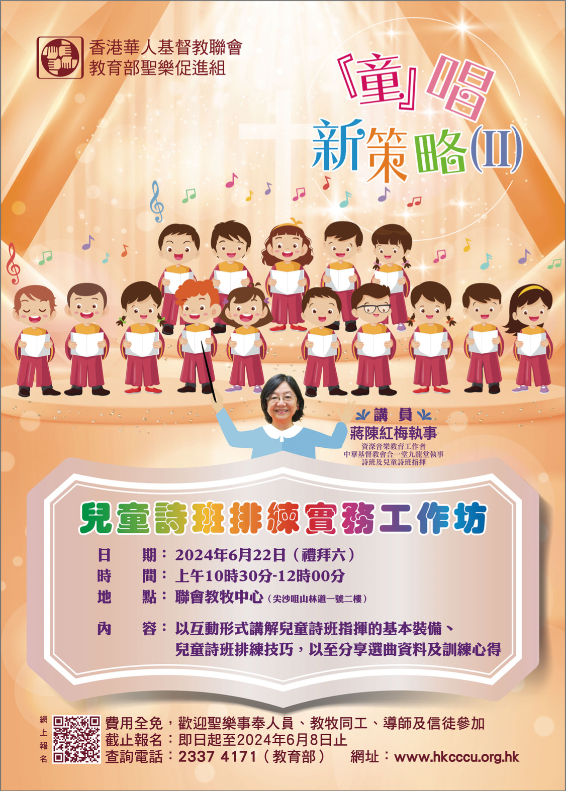 日期:2024年6月22日(礼拜六)时间:上午10时30分-12时00分地点:联会教牧中心(尖沙咀山林道一号二楼)讲员:蒋陈红梅执事(资深音乐教育工作者、中华基督教会合一堂九龙堂执事)内容:以互动形式讲解儿童诗班指挥的基本装备丶儿童诗班排练技巧,以至分享选曲资料及训练心得